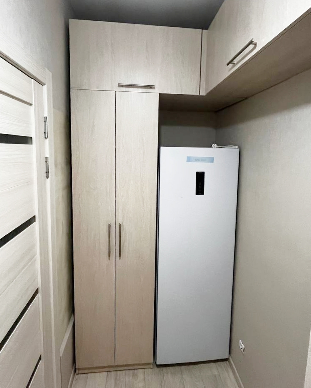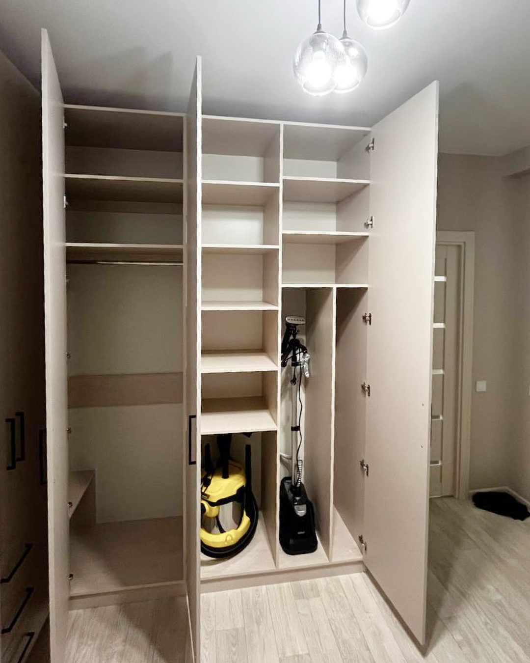 Коридор: вместительная система хранения на всю стену с дополнительной нишей для хозяйственных нужд.