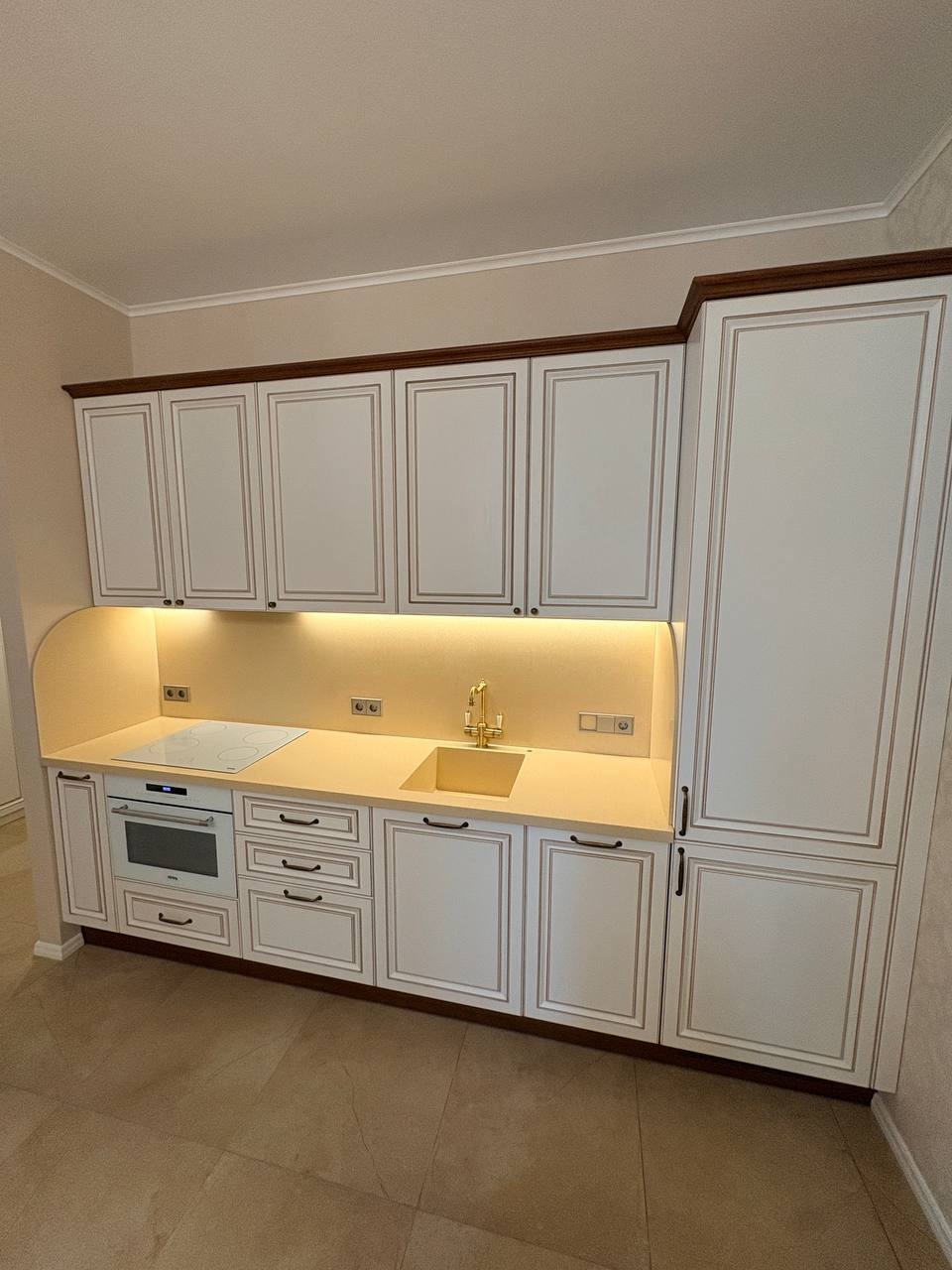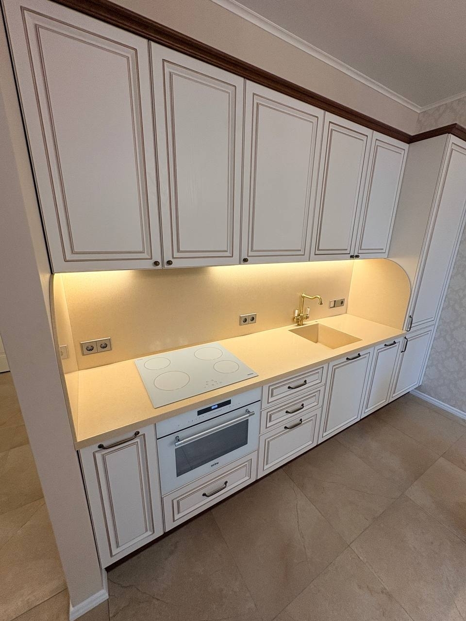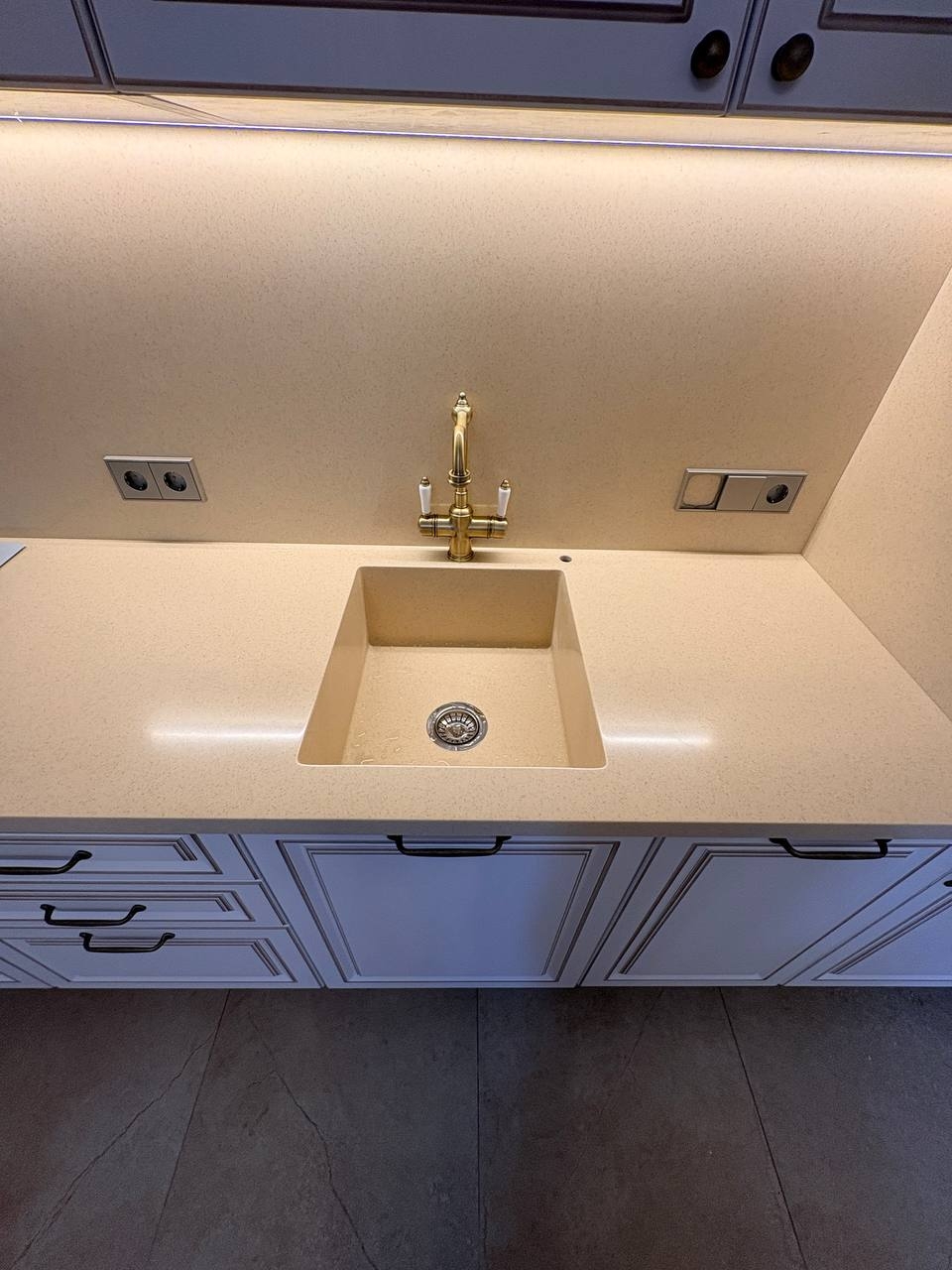 - Установлены встроенная мойка, латунный смеситель и дозатор, а также ручки в том же стиле.