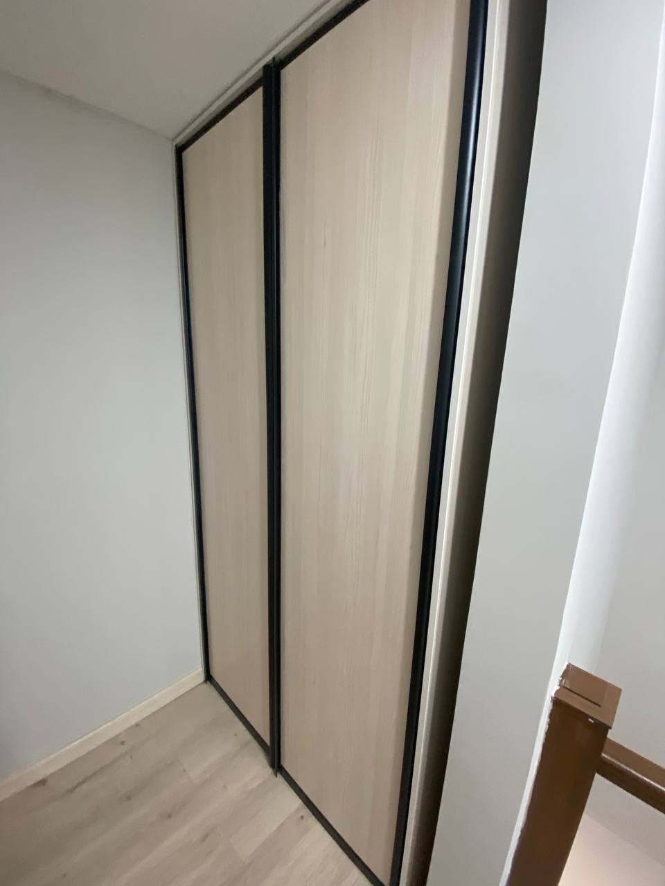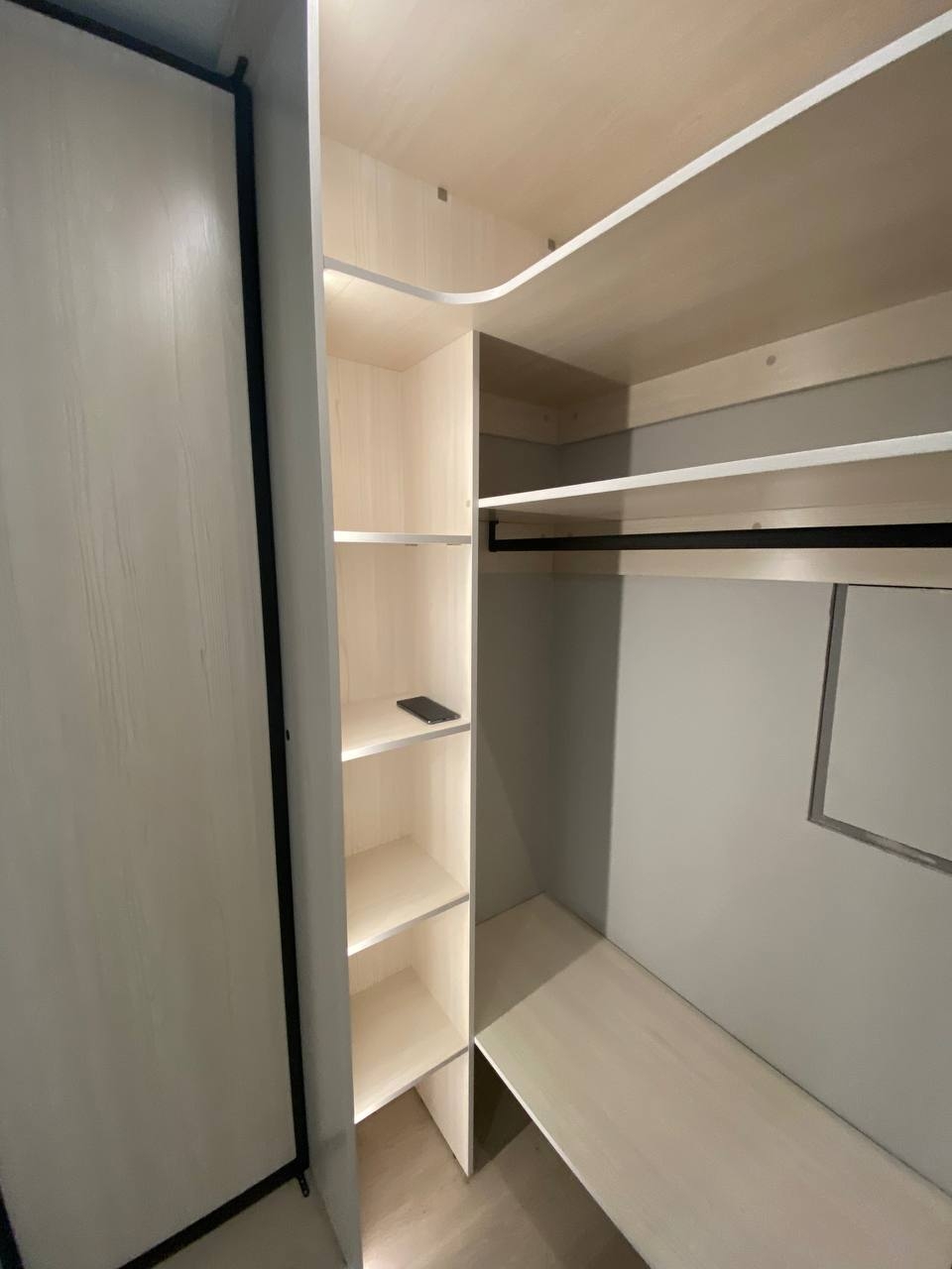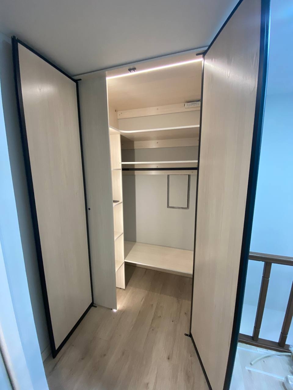 - Встроенный шкаф-купе с интегрированной подсветкой выполнен из ЛДСП Egger. Решение обеспечивает удобную систему хранения и поддерживает современную стилистику интерьера.