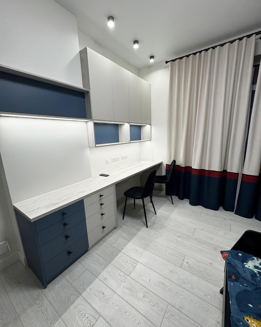 Организованы два полноценных рабочих места — с единой столешницей, персональным освещением и системами хранения. Это позволяет каждому ребёнку заниматься своими делами, не мешая друг другу.