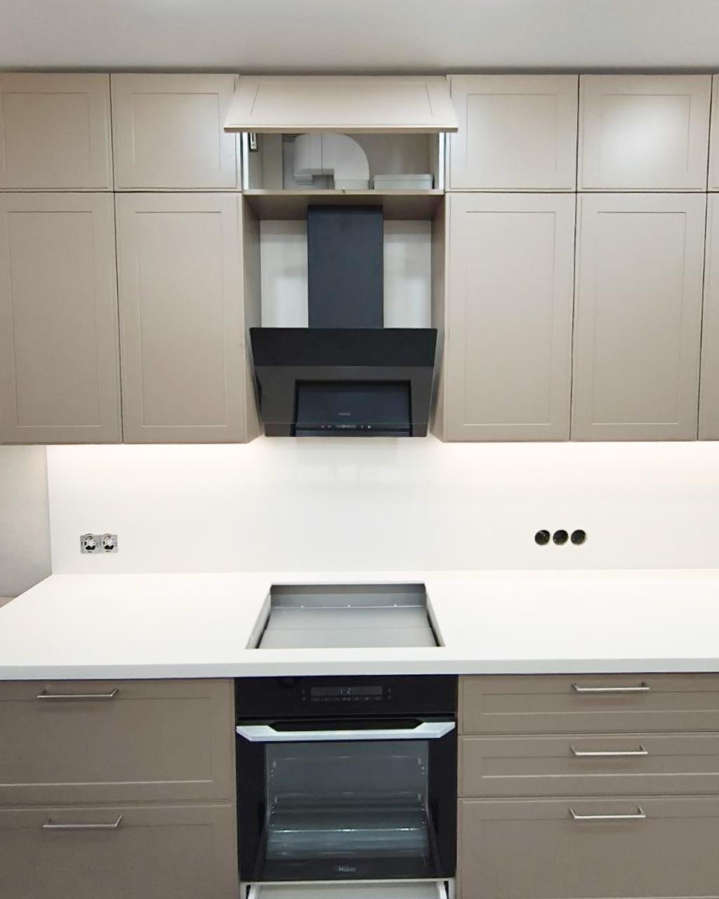 Проект реализован с задачей создать единое, гармоничное пространство без визуального перегруза, при этом сохранив полный функционал кухни. Особое внимание уделено снижению визуального шума и скрытой интеграции техники.