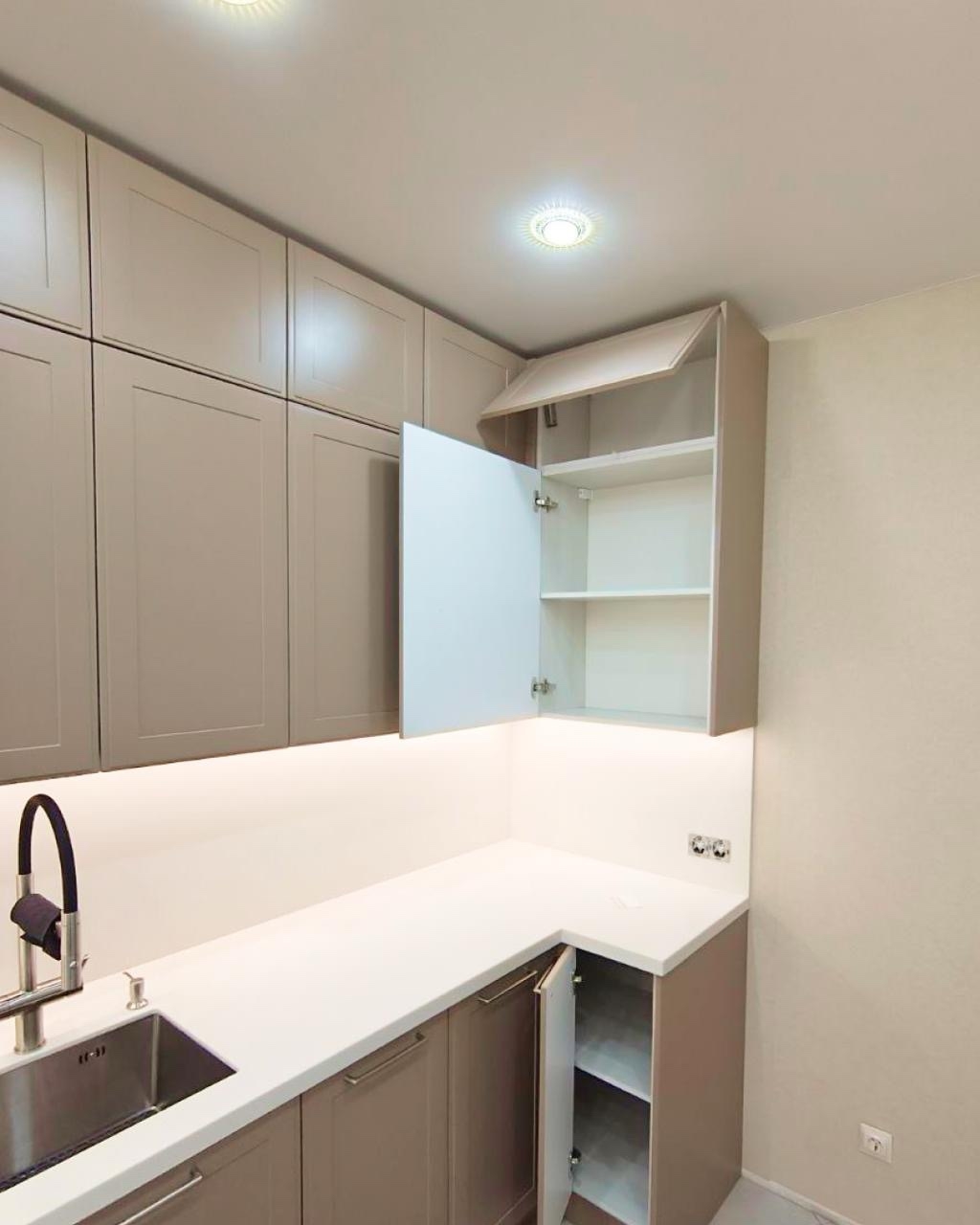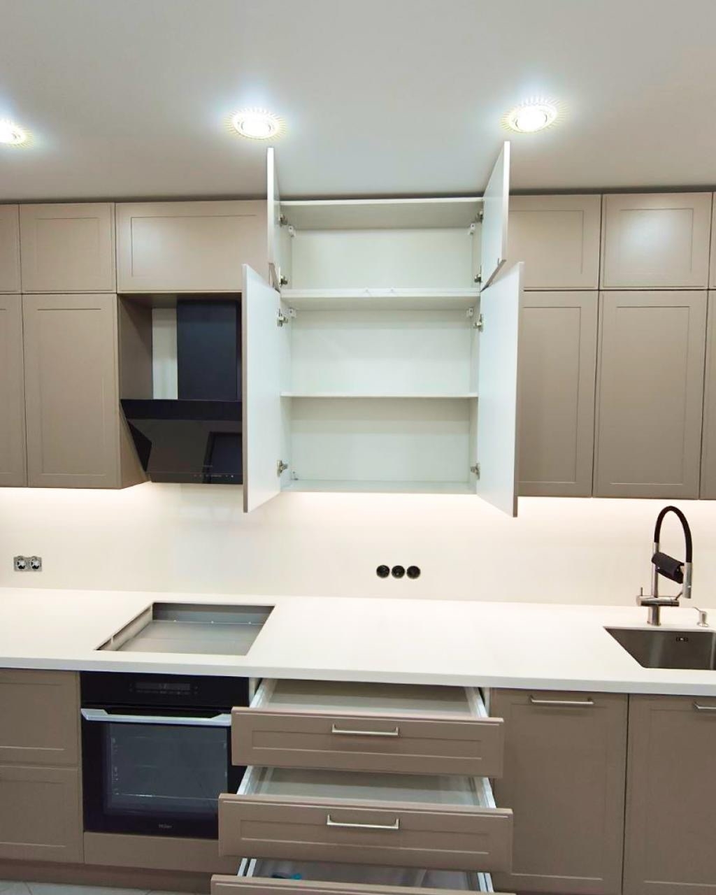 - Фасады — МДФ в плёнке ПВХ, декор «капучино», формирующий спокойную и универсальную цветовую основу.
