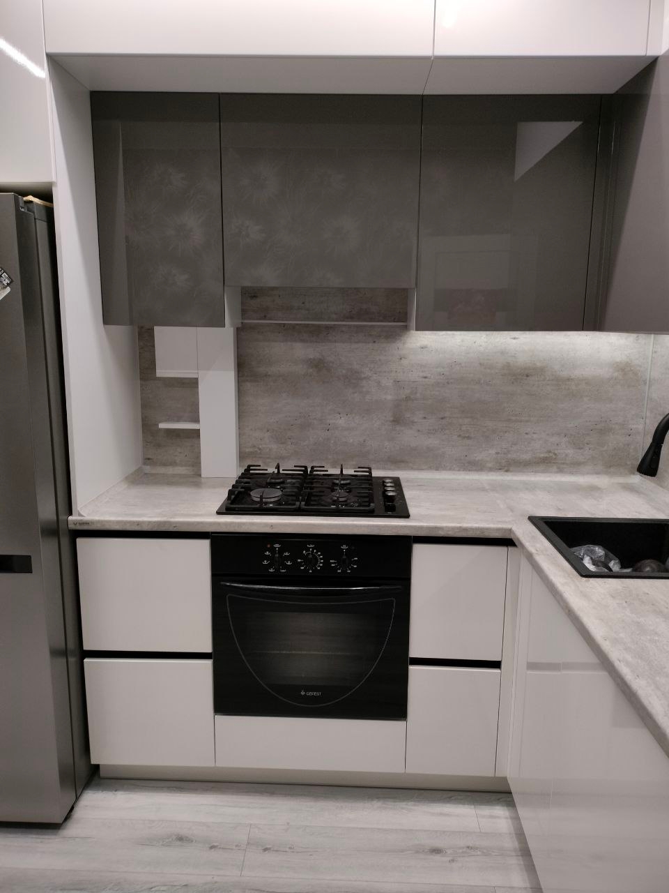Светлый глянцевый кухонный гарнитур для кухни со сложной геометрией