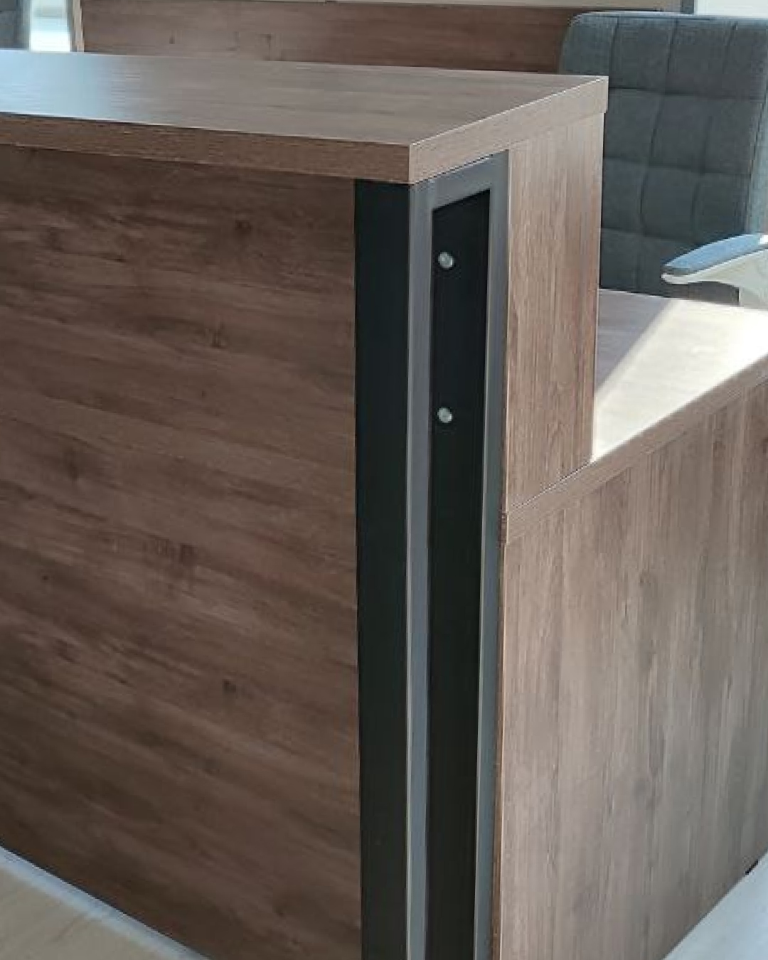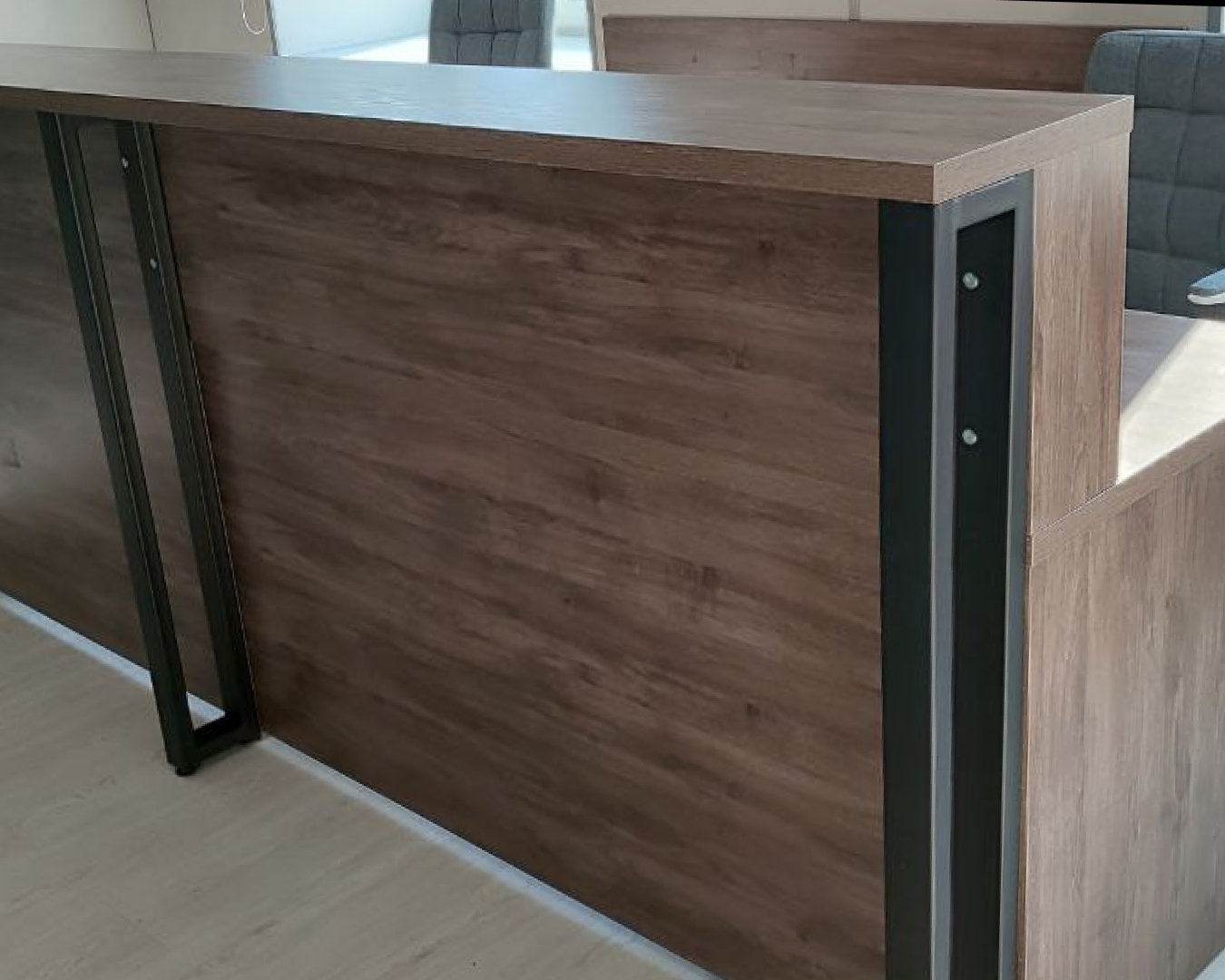 Стойка ресепшн выполнена с использованием индивидуально изготовленных металлических сферических опор. Конструкция обеспечивает удобство для посетителей — возможность комфортно заполнить документы и взаимодействовать с сотрудниками.